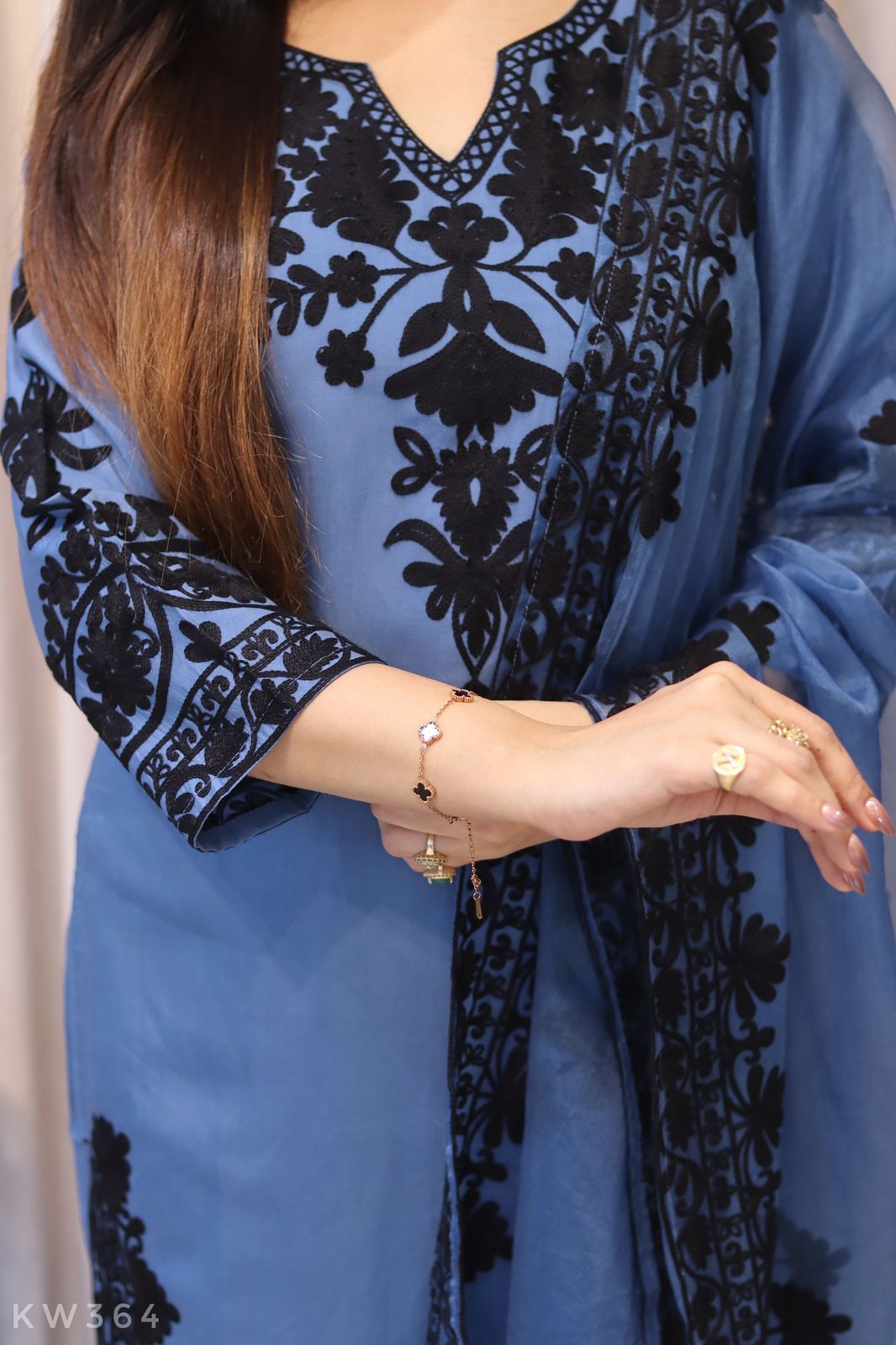 This kurti set features heavy embroidery crafted on pure cotton muslin fabric, combining traditional artistry with breathable comfort.