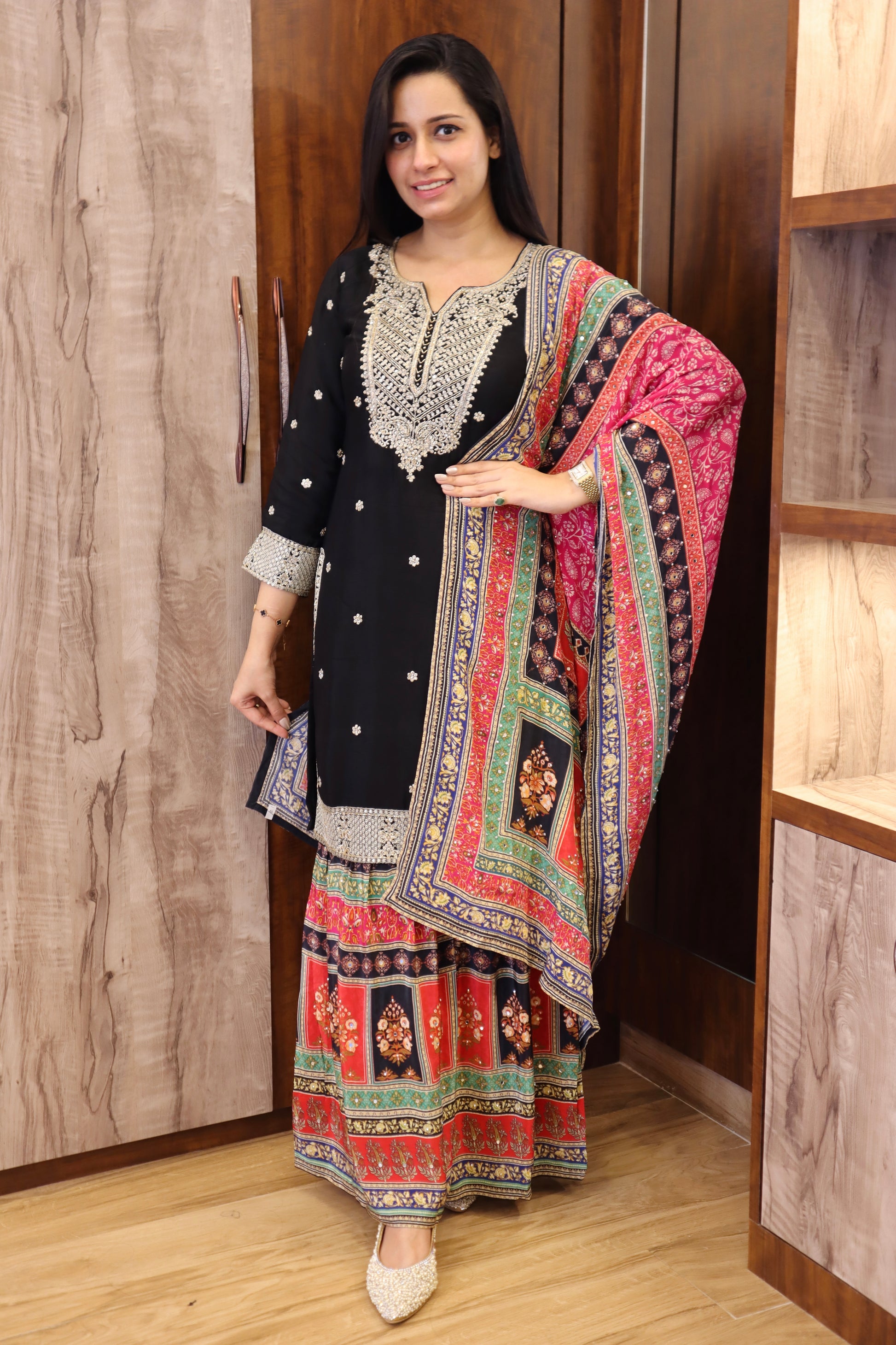 This Sharara Suit features a pure chinnon kurta with intricate heavy zari weaving, paired with a crepe sharara and a matching dupatta, design number KW359.