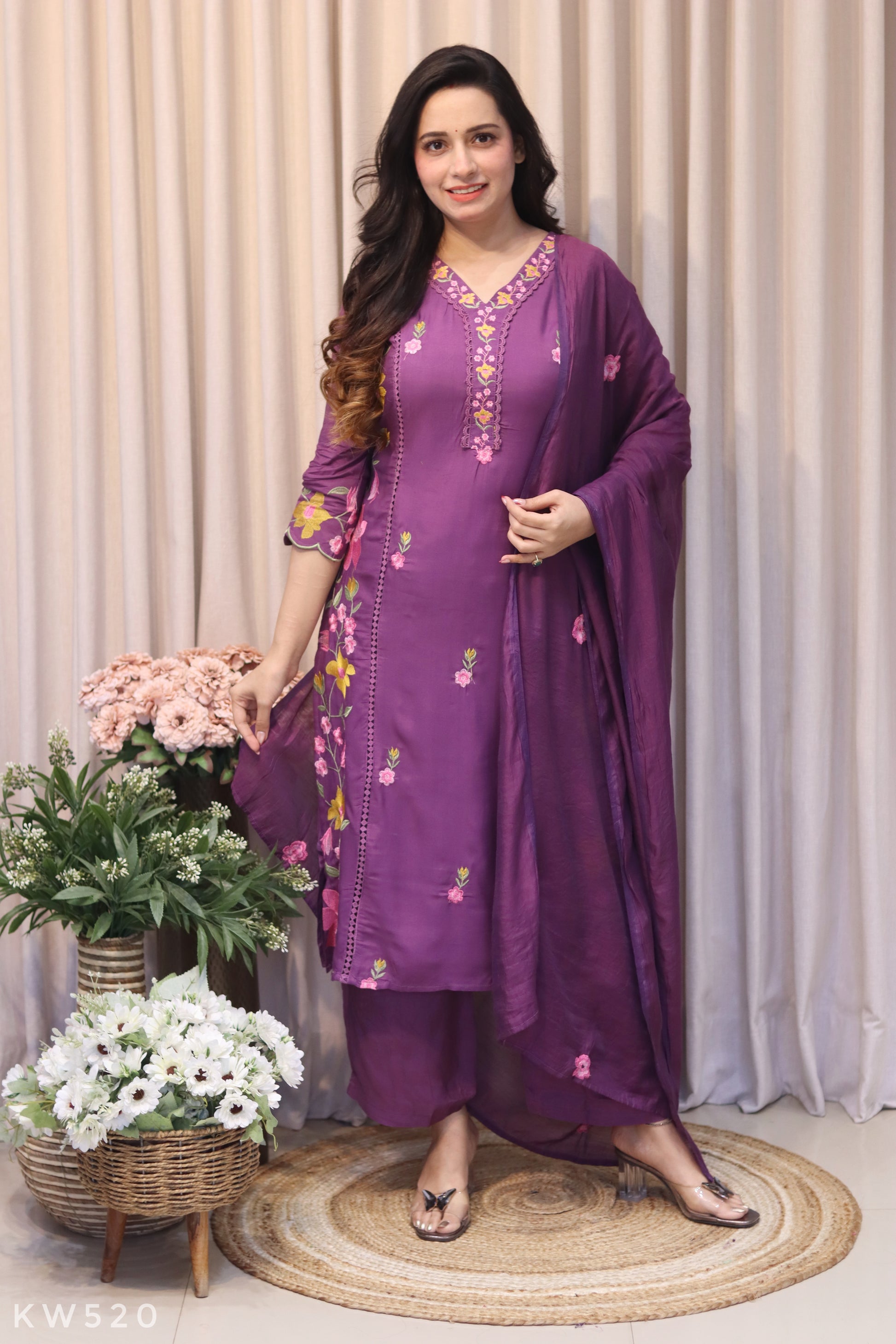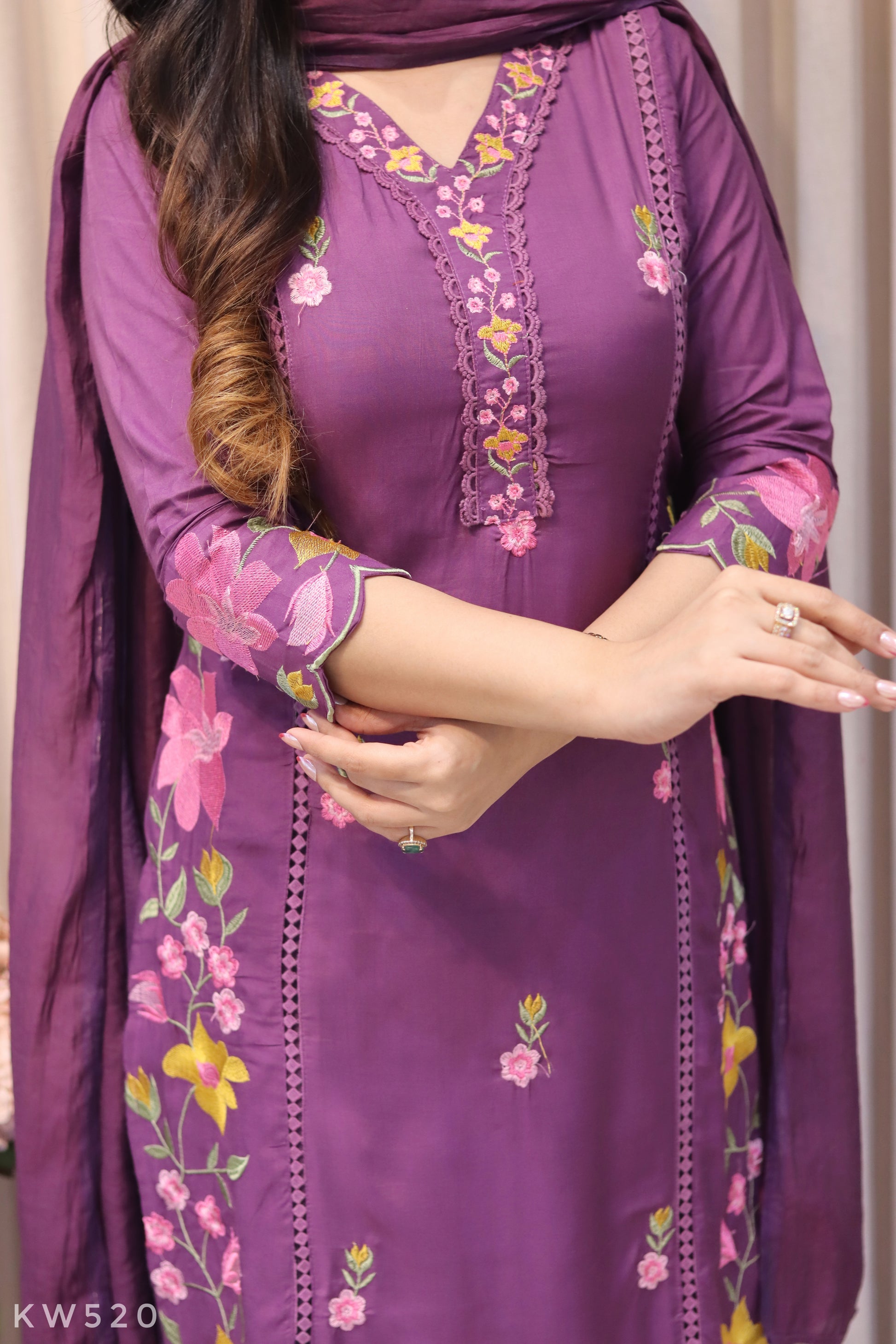 Elegant three-piece ensemble crafted from premium cotton muslin fabric, featuring intricate embroidery detailing throughout. This sophisticated collection includes a beautifully embellished kurti, coordinating pants, and a gracefully draped dupatta. The substantial embroidery work adds depth and refinement to each piece, making it ideal for special occasions and celebrations. Perfect for those who appreciate traditional craftsmanship combined with contemporary style.