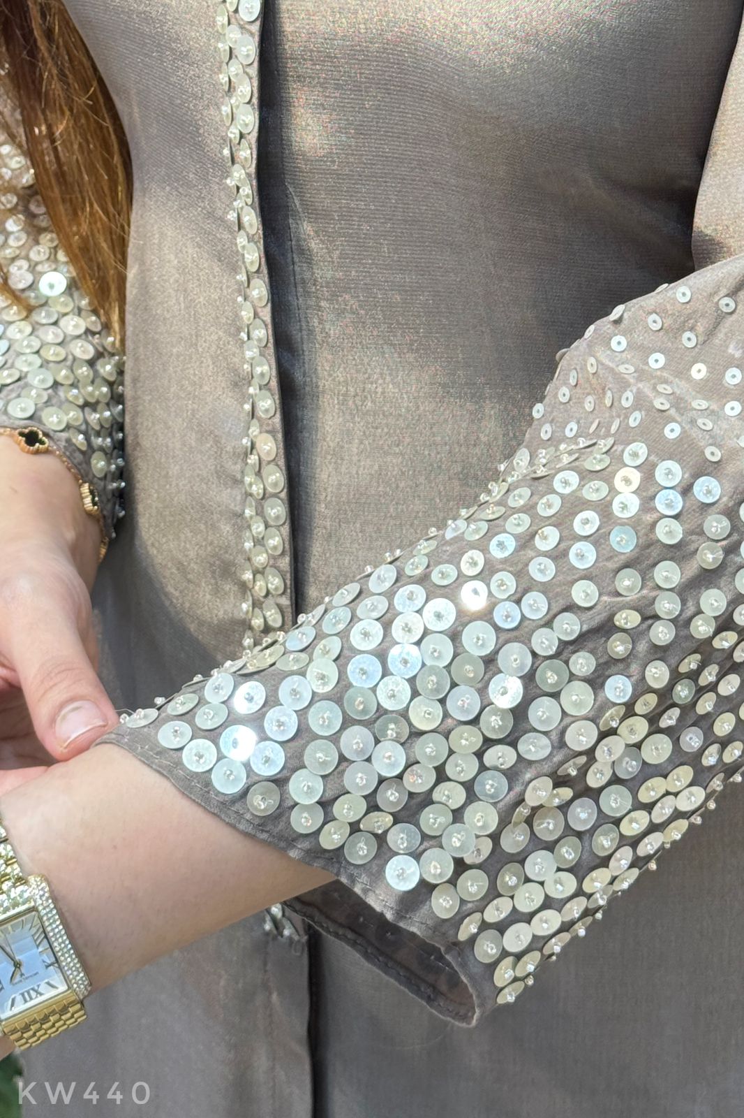 Crafted from pure crape silk, this A-line kurti and pant set features intricate heavy hand-sequined detailing for an elegant finish.