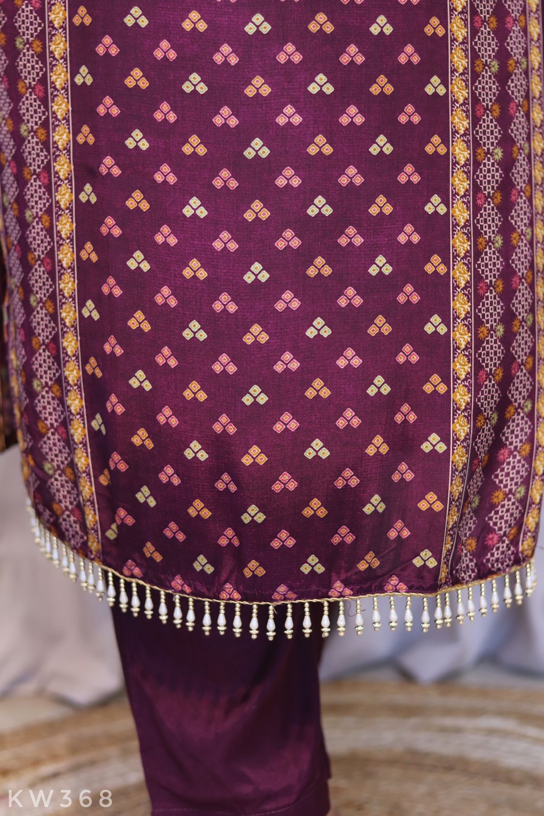 Crafted from pure crape silk, this premium kurti set features intricate hand-printed designs complemented by detailed embroidery, paired elegantly with matching pants and a dupatta.