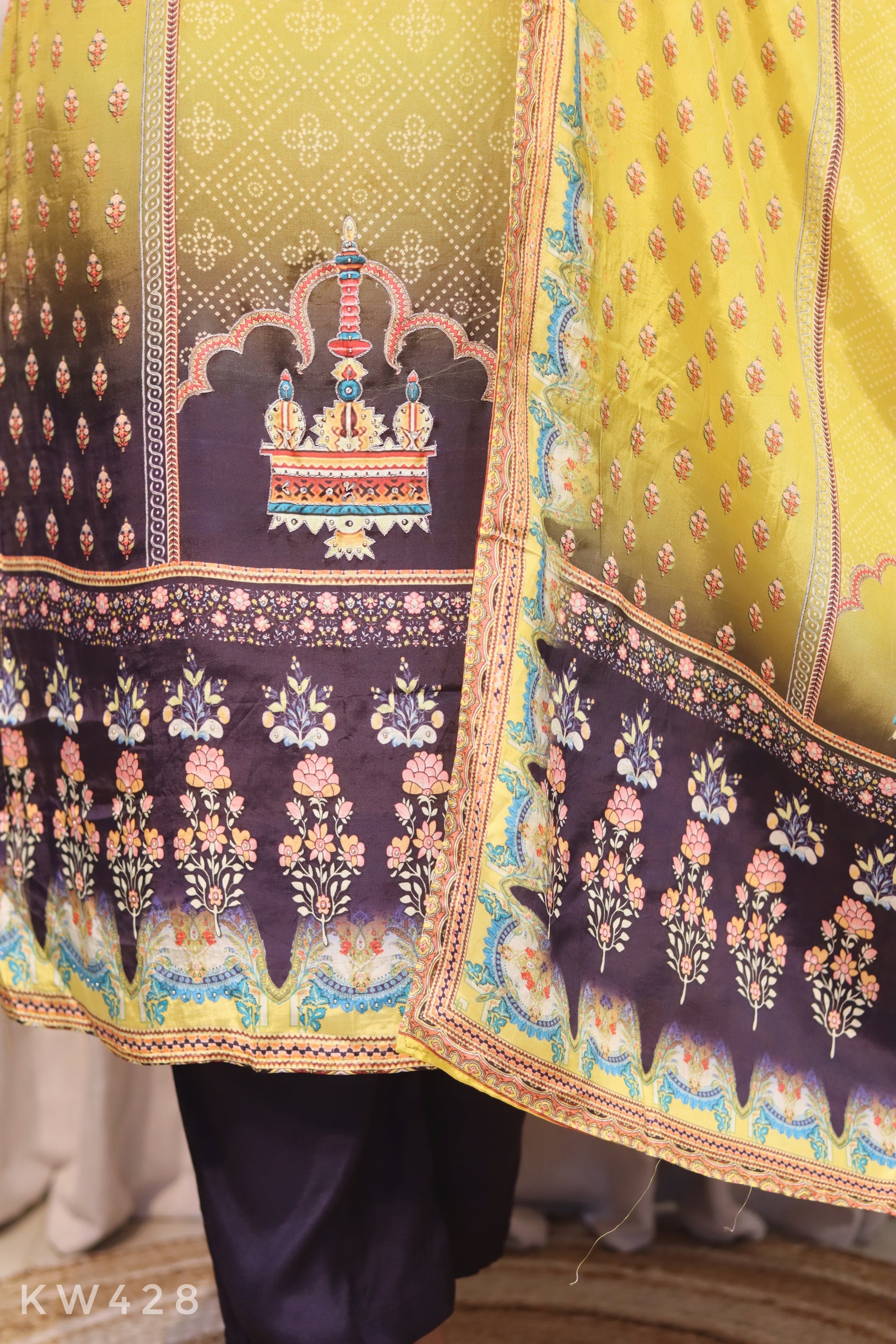 This Pure Crape Silk suit showcases detailed hand-embroidered work on the kurti, paired with matching pants and a dupatta, design no:- kw428
