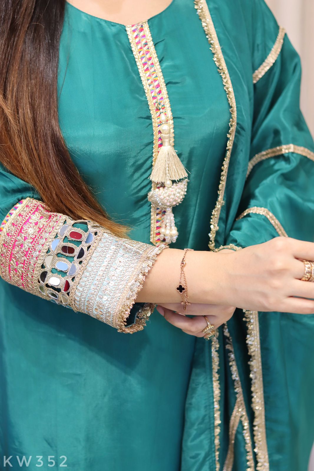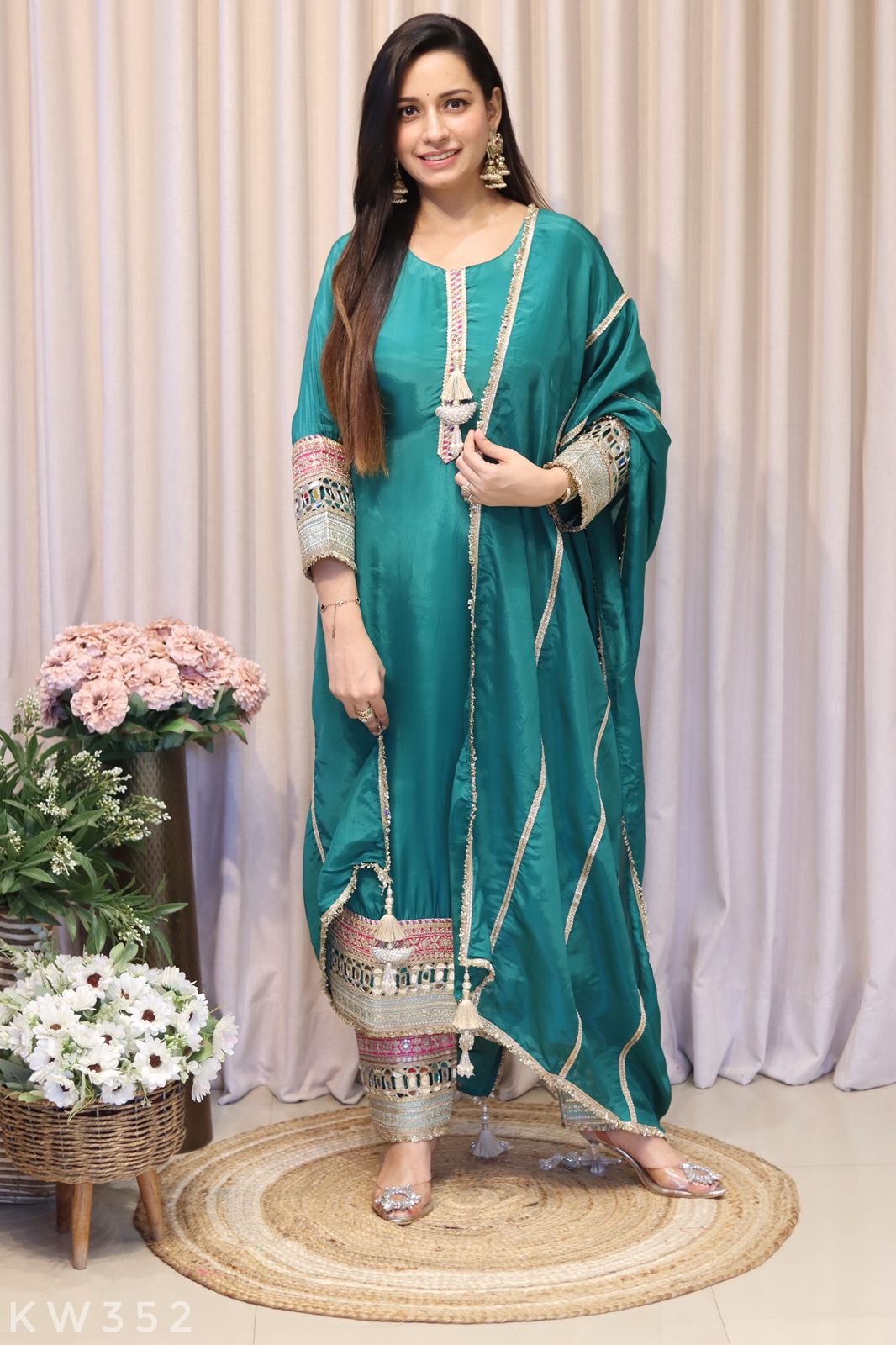 Experience elegance with this pure crape suit featuring intricate heavy mirror work, design number KW352.