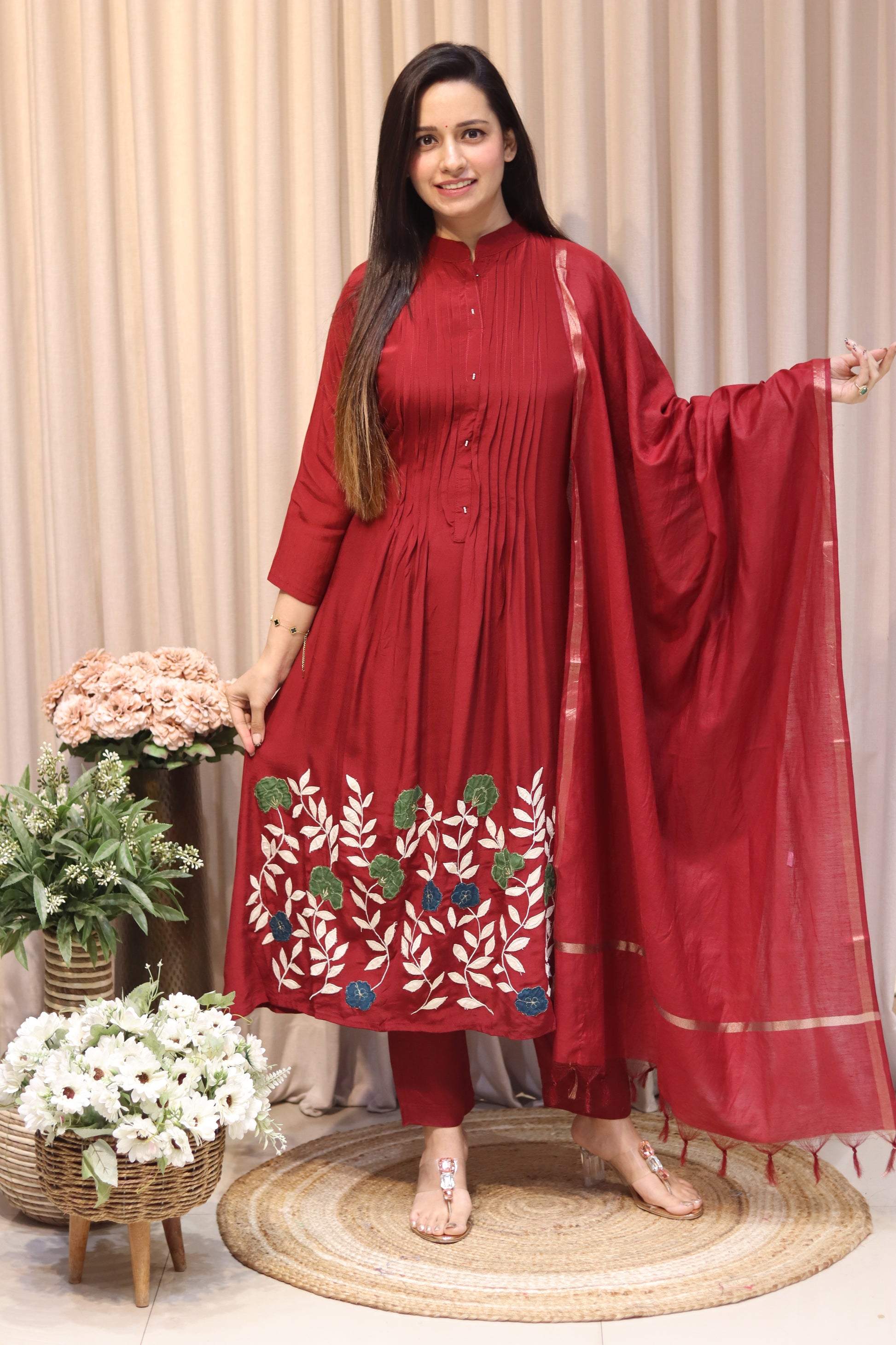 Elegant A-line kurti crafted from luxurious crape muslin silk, adorned with intricate embroidery detailing. This sophisticated ensemble includes a premium dupatta and coordinating pant, perfect for those who appreciate refined craftsmanship. Ideal for special occasions or elevated everyday wear, this piece celebrates timeless design with a contemporary silhouette.