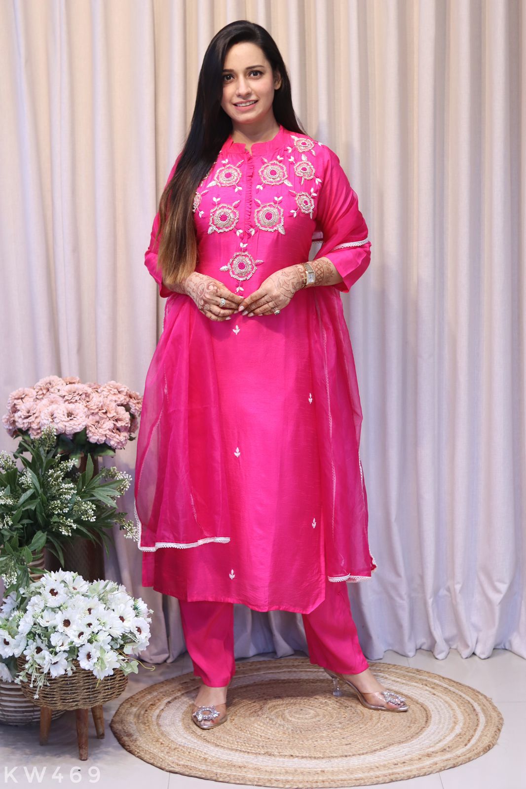 This exquisite Pure Dola Silk Kurti features intricate heavy hand embroidery, complemented by a premium organza dupatta and matching pants for an elegant, refined ensemble.