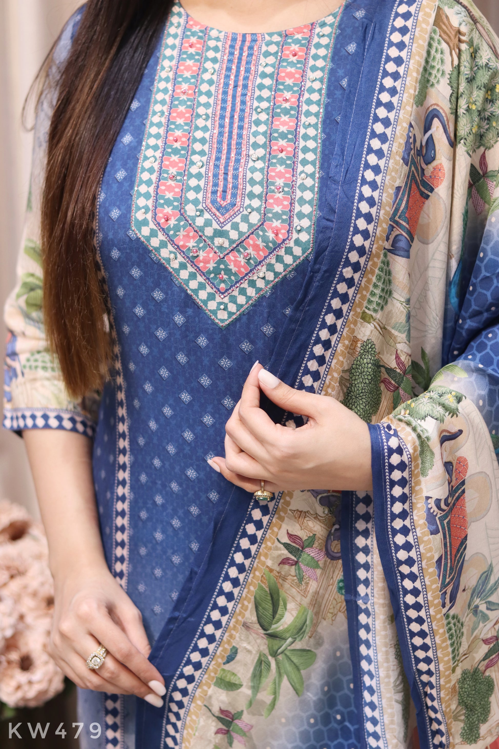 Crafted from luxuriously soft muslin silk, this three-piece ensemble features a premium printed kurti paired with coordinating pants and dupatta. The buttery-smooth fabric drapes elegantly while maintaining breathability, making it ideal for both casual wear and festive occasions. The refined print design adds sophistication to your ethnic wardrobe.