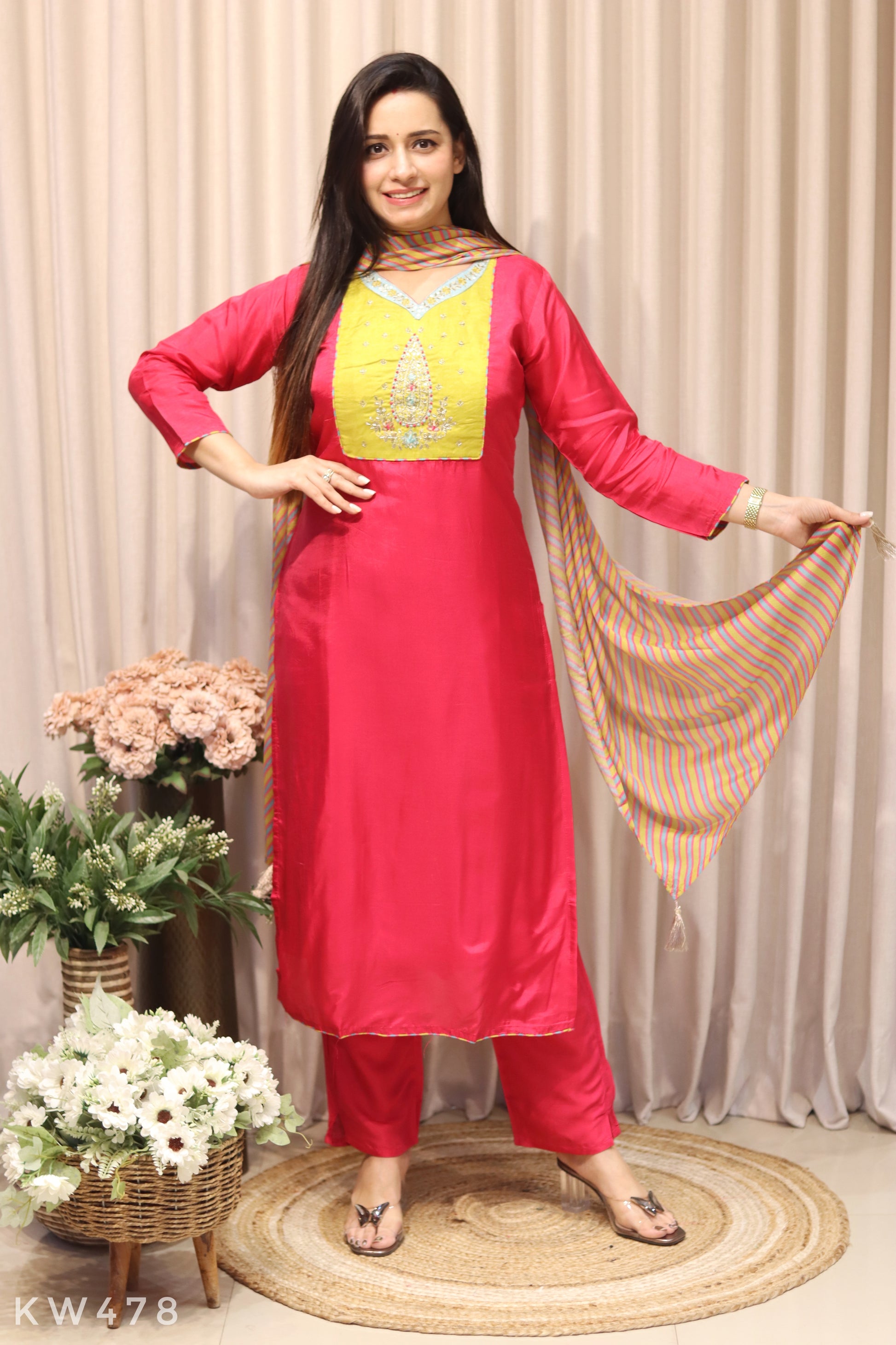 Crafted from premium Russian silk, this sophisticated kurti showcases meticulous hand embroidery with striking contrast detailing. The ensemble includes a coordinating chinnon dupatta and matching pant, delivering a refined three-piece set ideal for special occasions and celebrations.