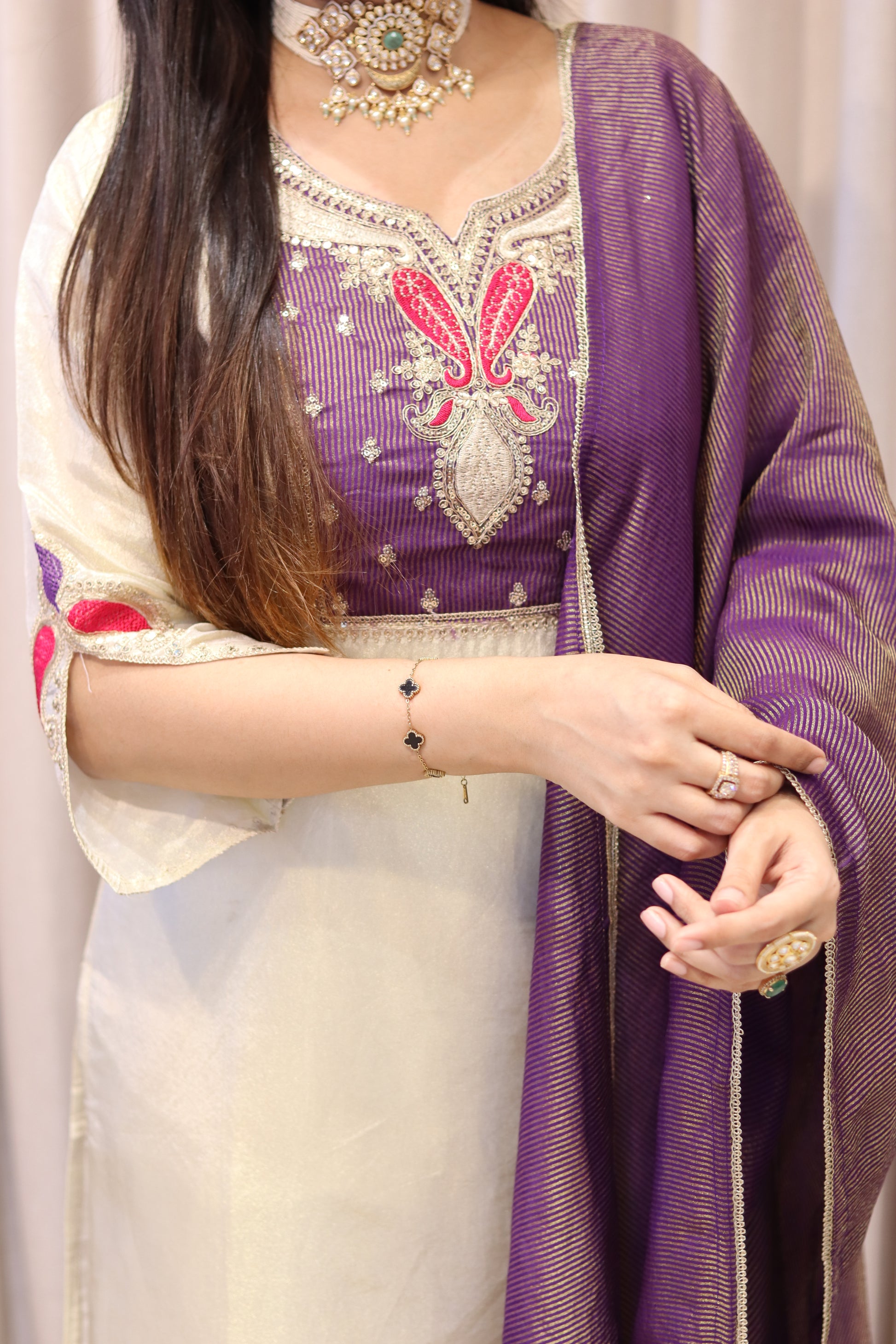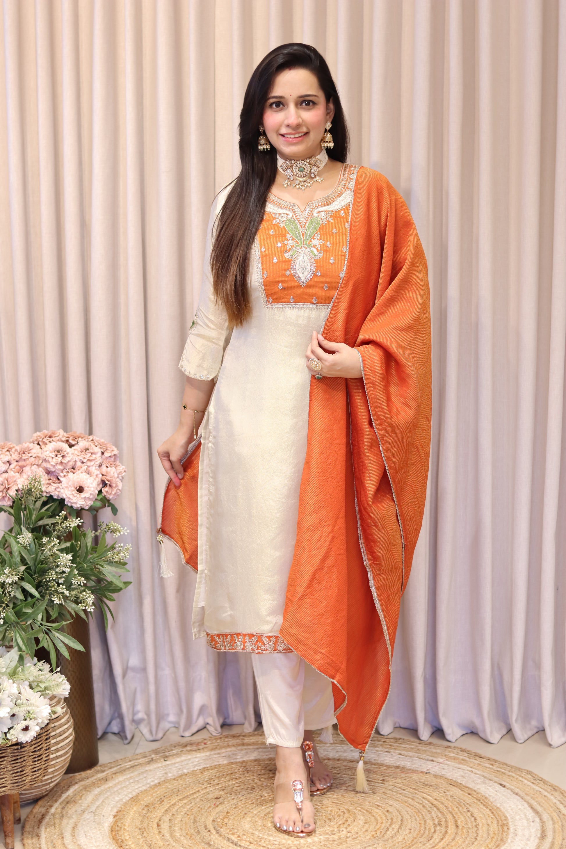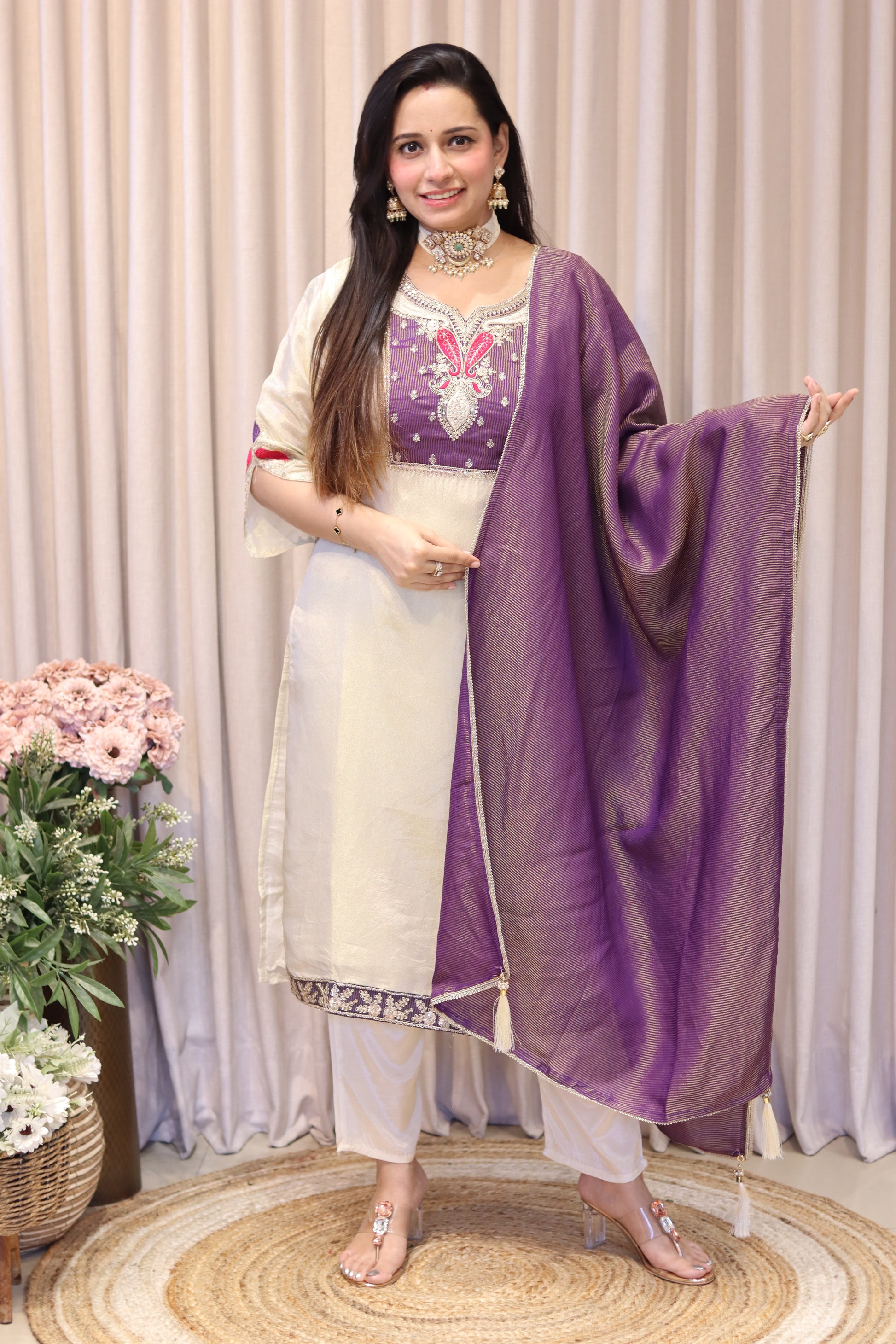Elevate your ethnic wardrobe with this exquisite tissue silk ensemble. Featuring intricate gota zari embroidery work, this three-piece set includes a beautifully crafted kurti, coordinating pants, and an ornate designer dupatta. Perfect for celebrations and special occasions, each piece showcases traditional craftsmanship with a contemporary silhouette that flatters effortlessly.