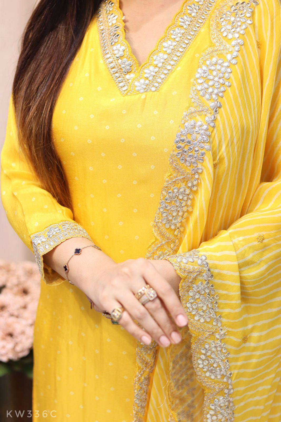 Experience elegance with this ensemble featuring a kurti, pant, and dupatta crafted from pure Russian silk, adorned with intricate Gota work detailing.